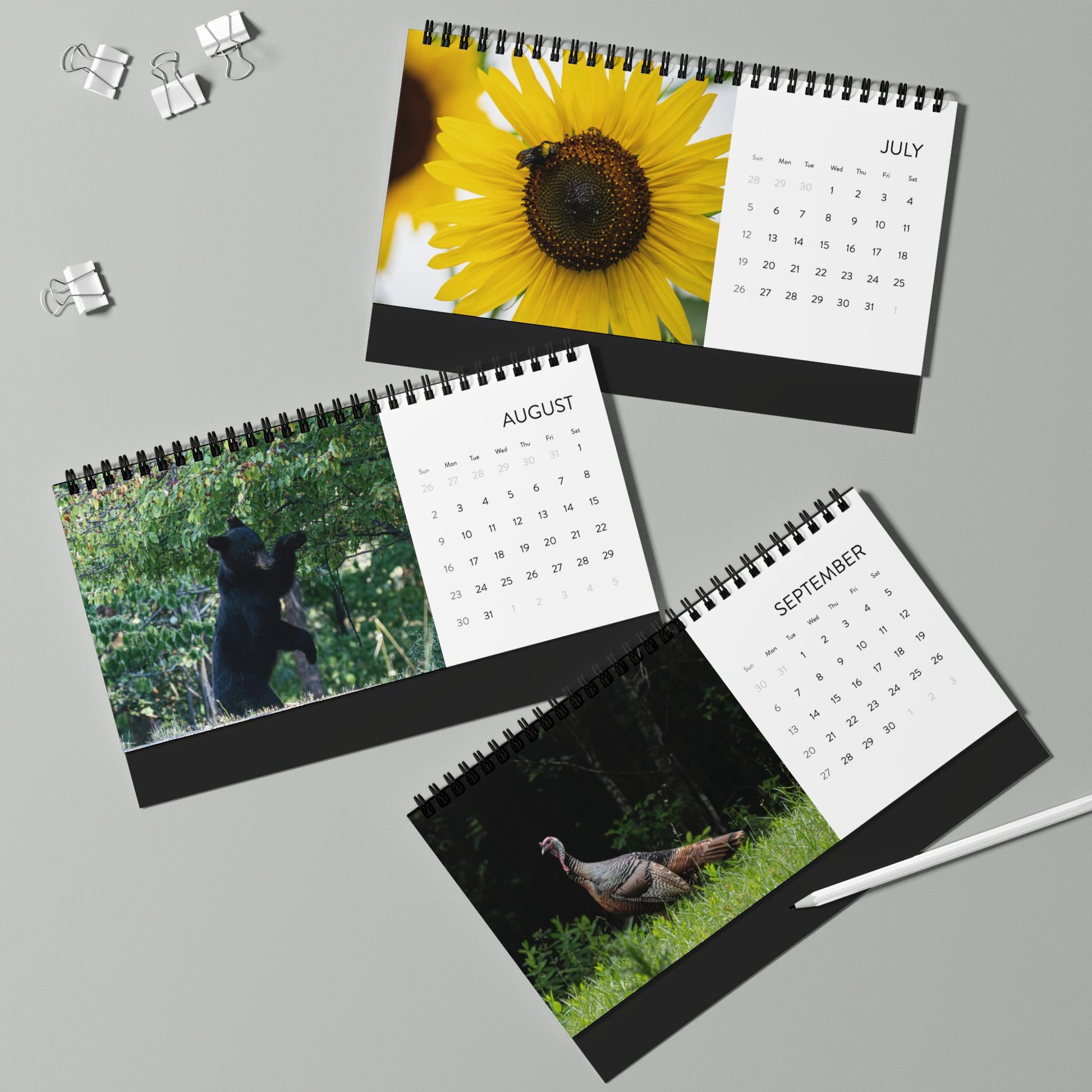 Bright, compact, and full of personality — this 2026 desktop calendar brings a rotating gallery of nature into your everyday workspace. Crisp, vibrant prints sit beside a clean monthly grid so you can glance at dates while enjoying full-bleed photography that sparks calm and curiosity. The sturdy black tent backing and metal spiral keep it upright and easy to flip through, while the matte 250 gsm pages give a refined, ink-rich finish that reduces glare. Small in footprint but big on presence, it slips beside a laptop, on a bookshelf, or near a kitchen counter to mark months with color and charm.