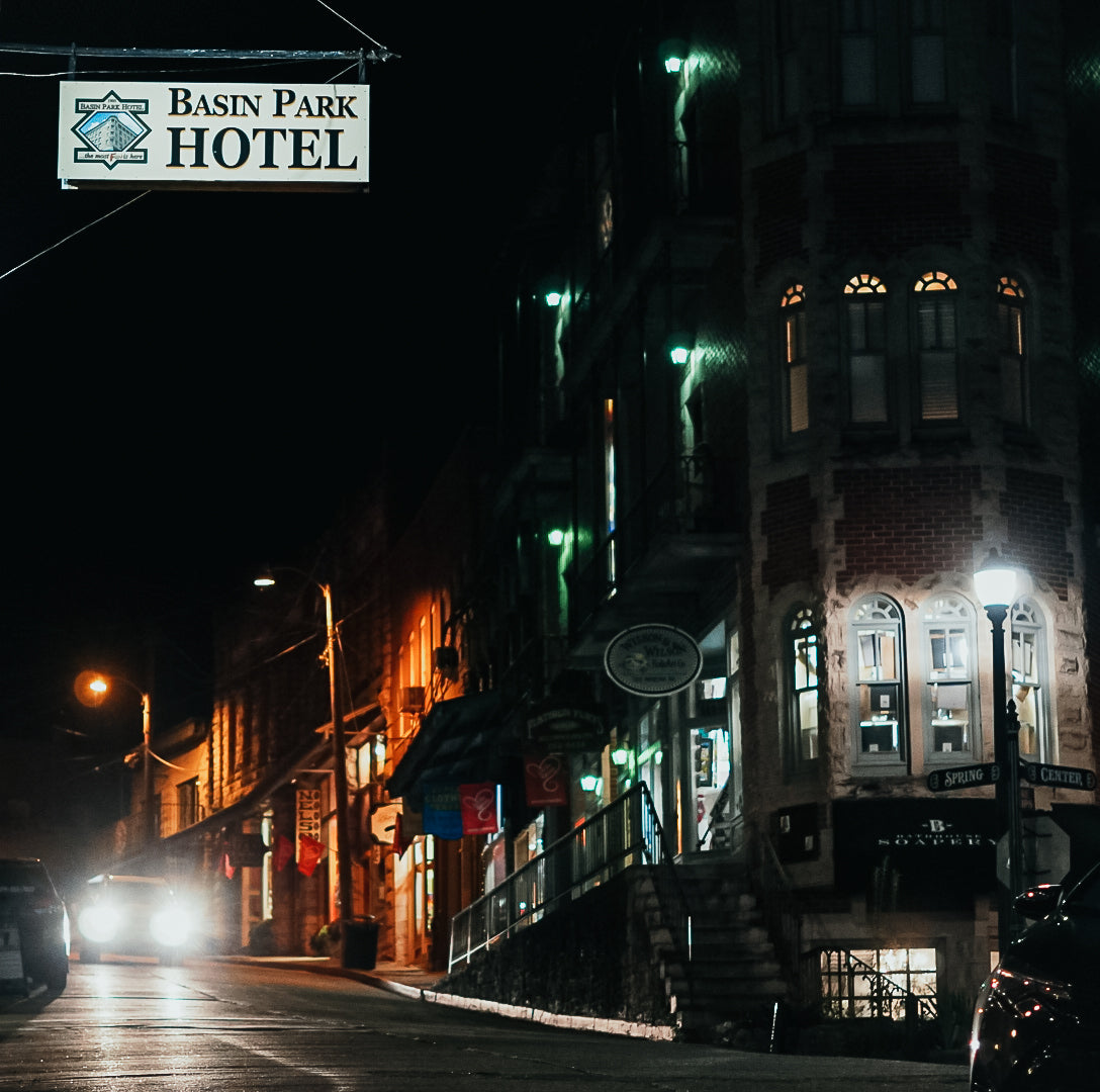 A moody scene of downtown Eureka Springs, Arkansas, featuring the iconic Basin Park Hotel sign glowing above the quiet street. Warm storefront lights and historic architecture capture the town's timeless mysterious charm.