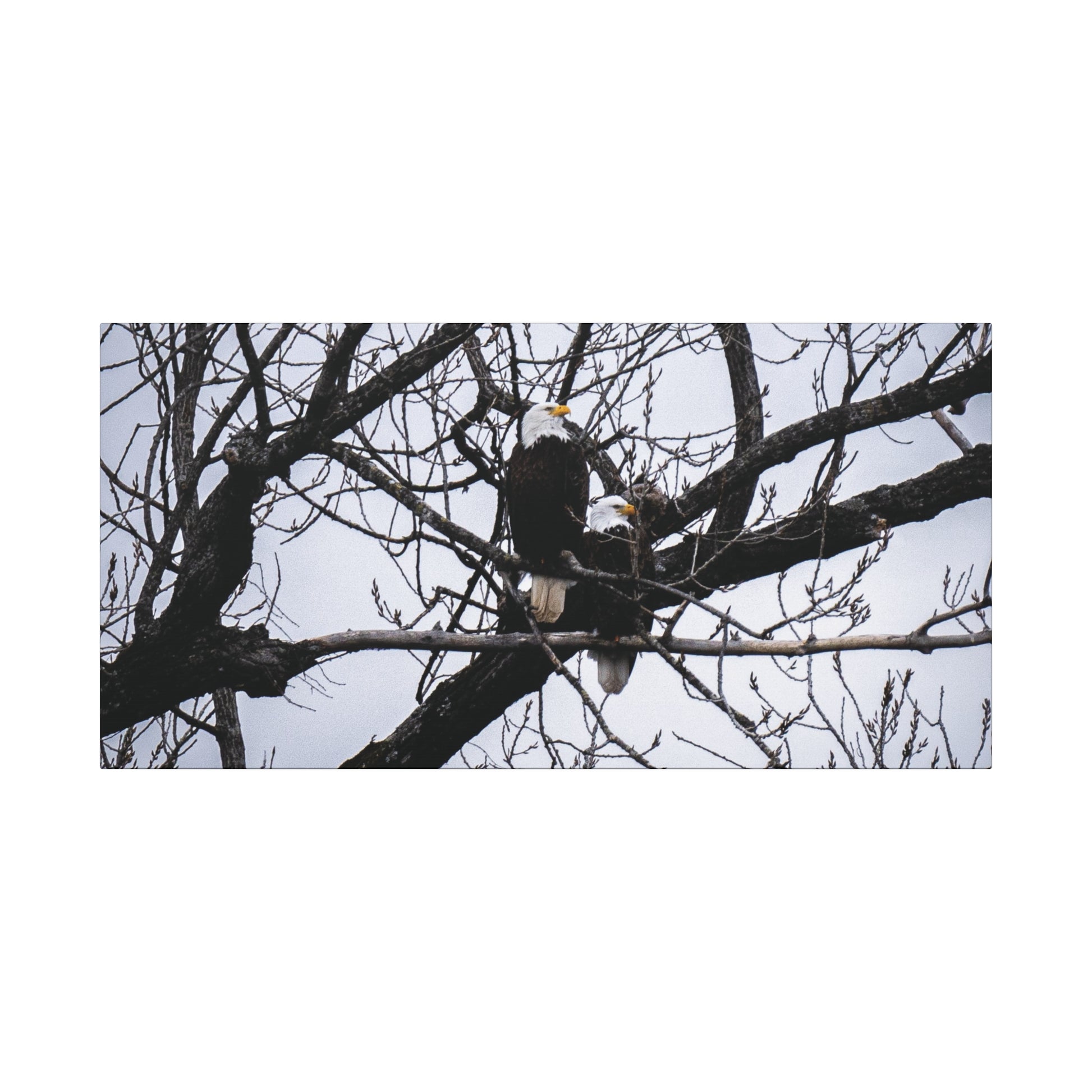 Two bald eagles perch side by side above the White River, framed by bare winter branches and a crisp white sky. This 30"x15" canvas captures the quiet majesty of the Ozarks in winter, bringing a sense of calm, strength, and natural wonder into any space.